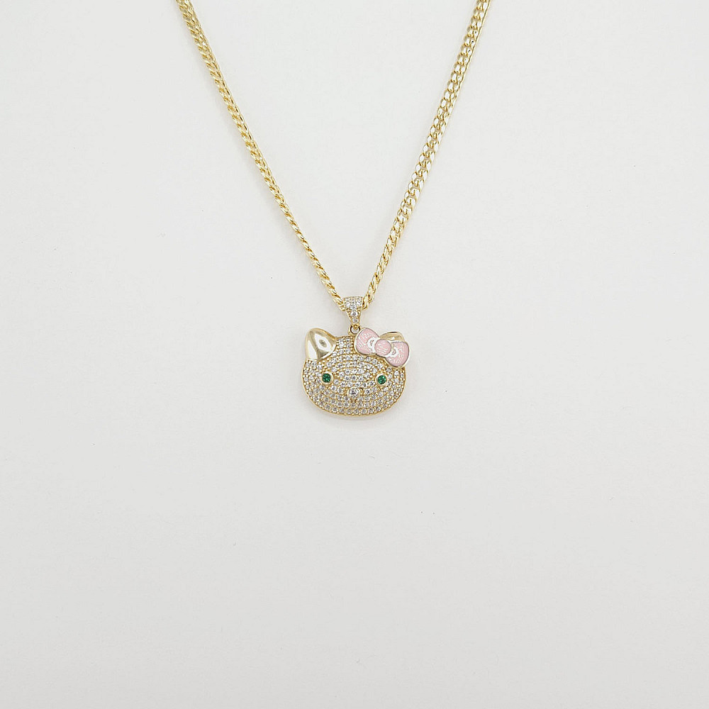 14K Gold Kitty Face Charm with Pink Bow – CZ Diamond Accents