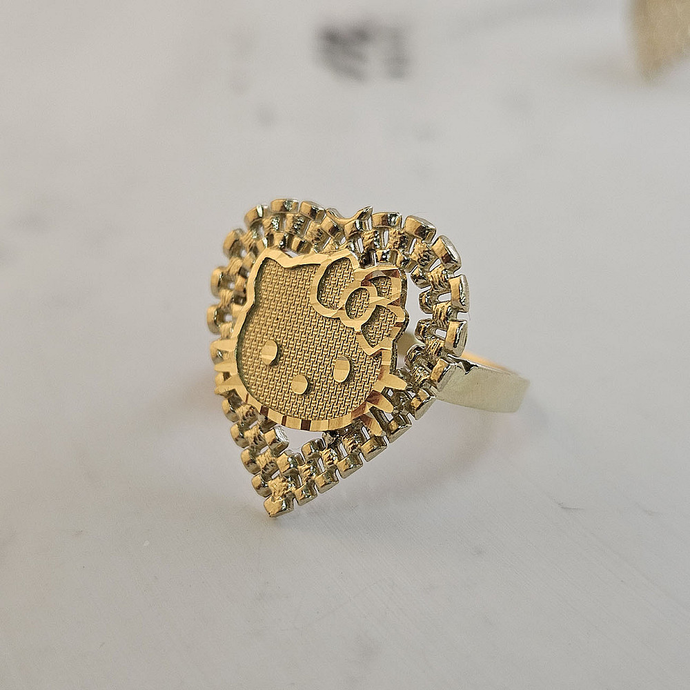 Hello Kitty ring crafted in real 10K gold. Designed with a bold heart-shaped frame in a Rolex-style chain pattern, it features an intricately detailed Hello Kitty face at the center — the perfect blend of cute and classy. this ring makes a charming statement for all ages.