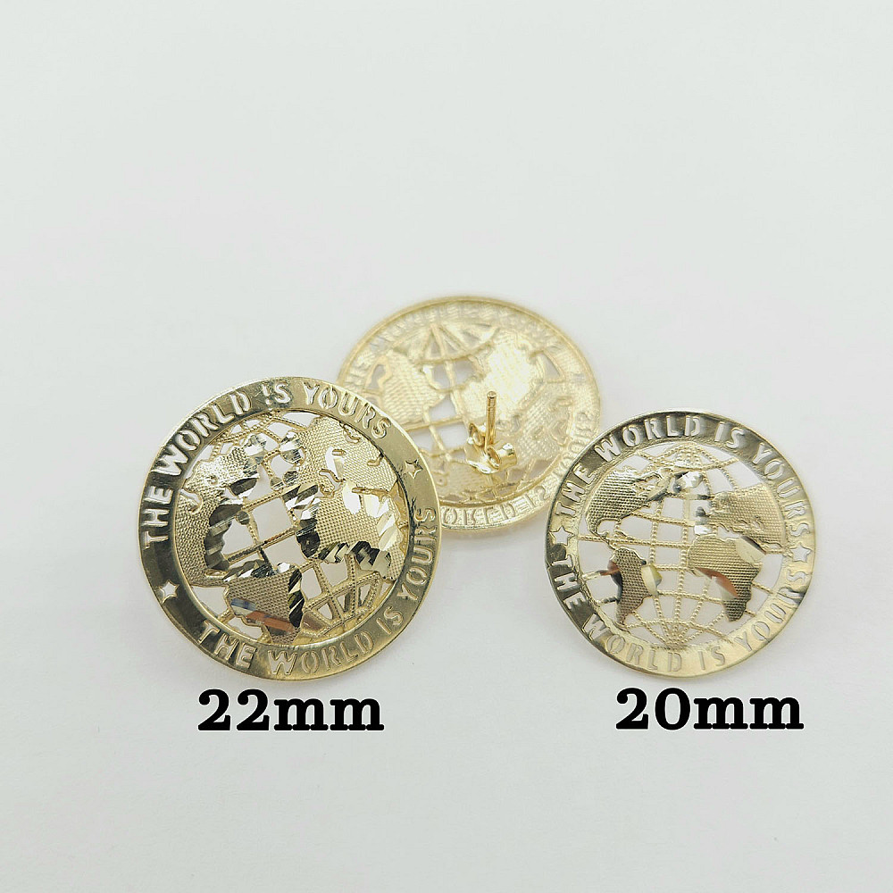 Show the world your ambition with these striking 10K gold globe earrings. Featuring the powerful phrase “THE WORLD IS YOURS” around a detailed cut-out world map, these earrings blend meaning with modern style. Available in 20mm and 22mm sizes to suit your look.